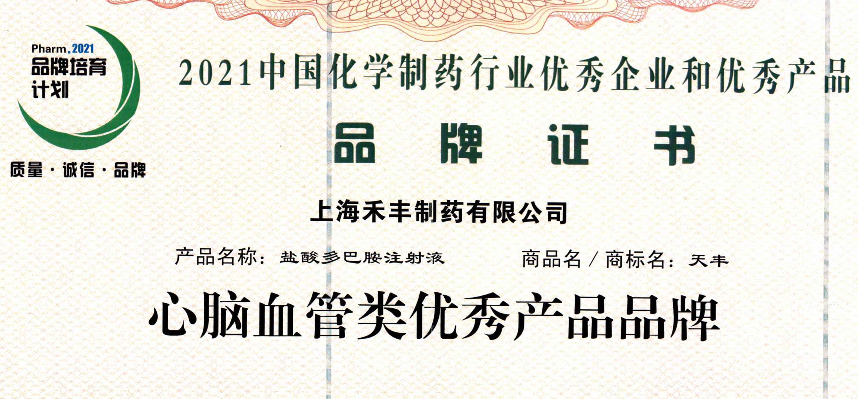 2021年10月12日,中國化學制藥工業協會在湖北武漢舉辦“2021化學制藥行業品牌峰會暨九屆七次理事(擴大)會”,上海禾豐制藥有限公司成功入圍“2021化學制藥行業優秀企業和優秀產品品牌培育計劃”,公司的核心產品——鹽酸多巴胺注射液——榮獲“心腦血管類優秀產品品牌”證書。
