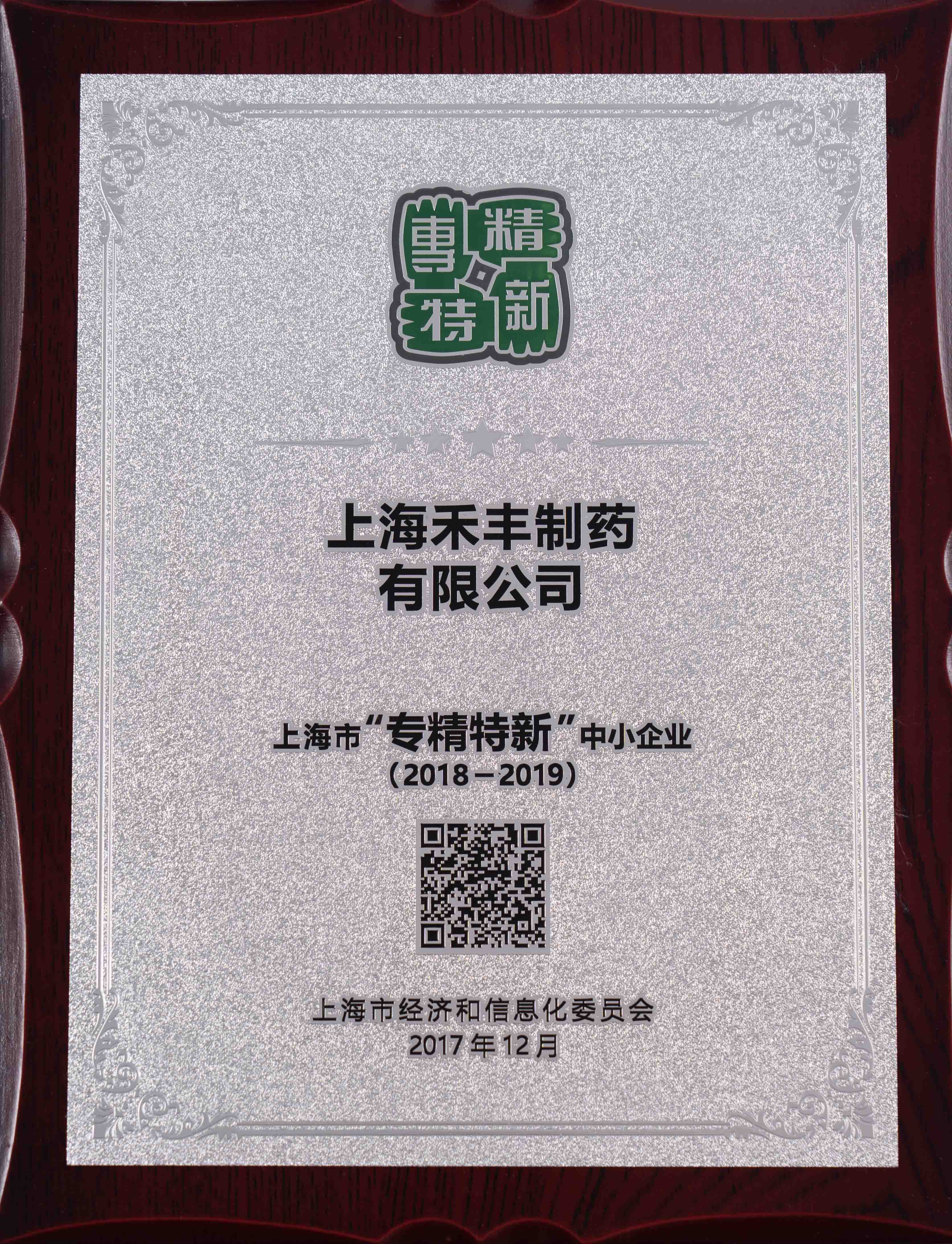 上海禾豐制藥有限公司通過"2019年度上海市專精特新企業"復審