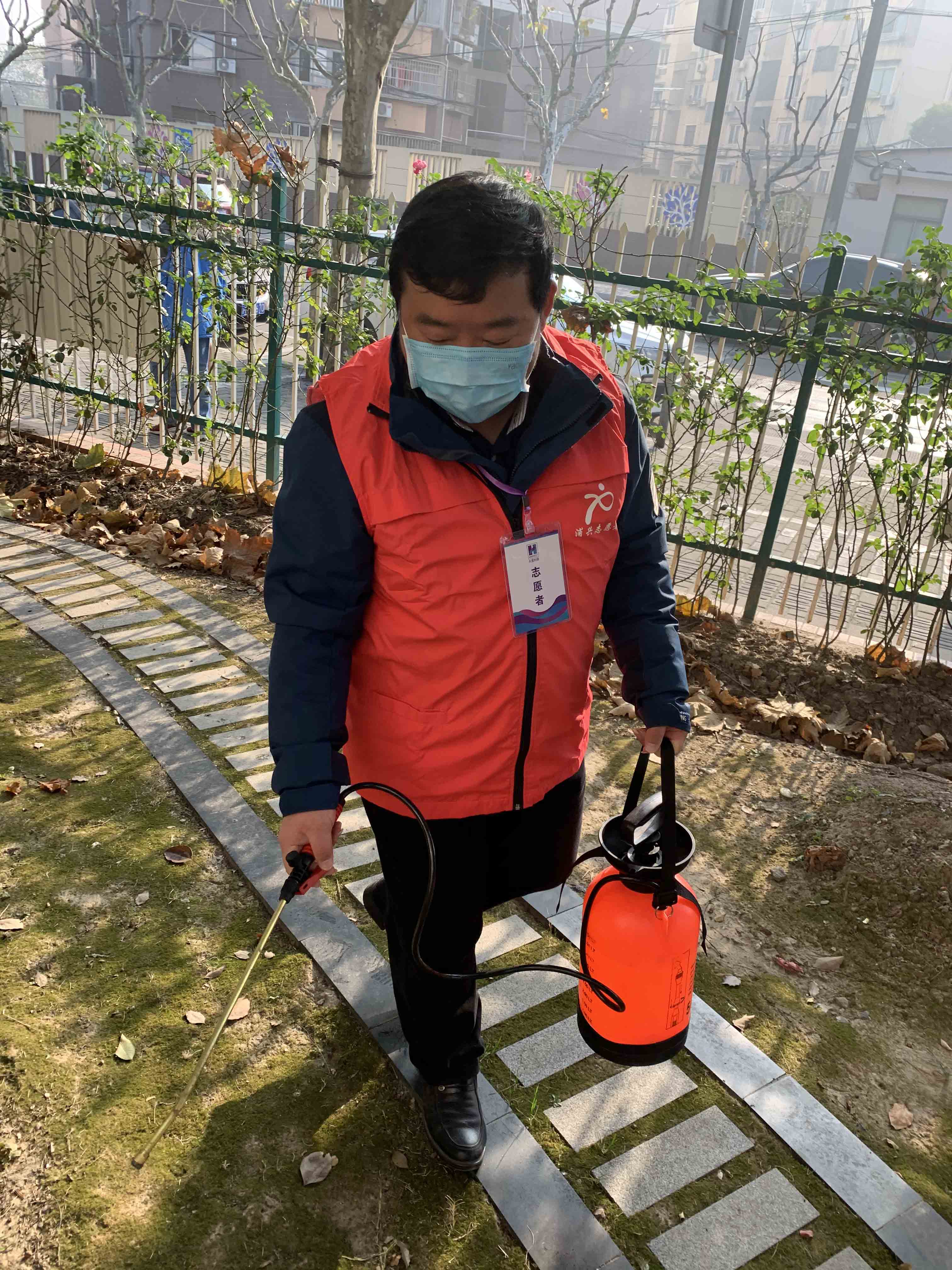 志愿者們帶上手壓式噴壺來到為老服務中心的花園里開展公共區域的消毒清潔。寒冷的天氣擋不住志愿者們的熱情,他們一手拎著噴壺,一手拿著噴頭,仔細消毒著花園的角角落落。