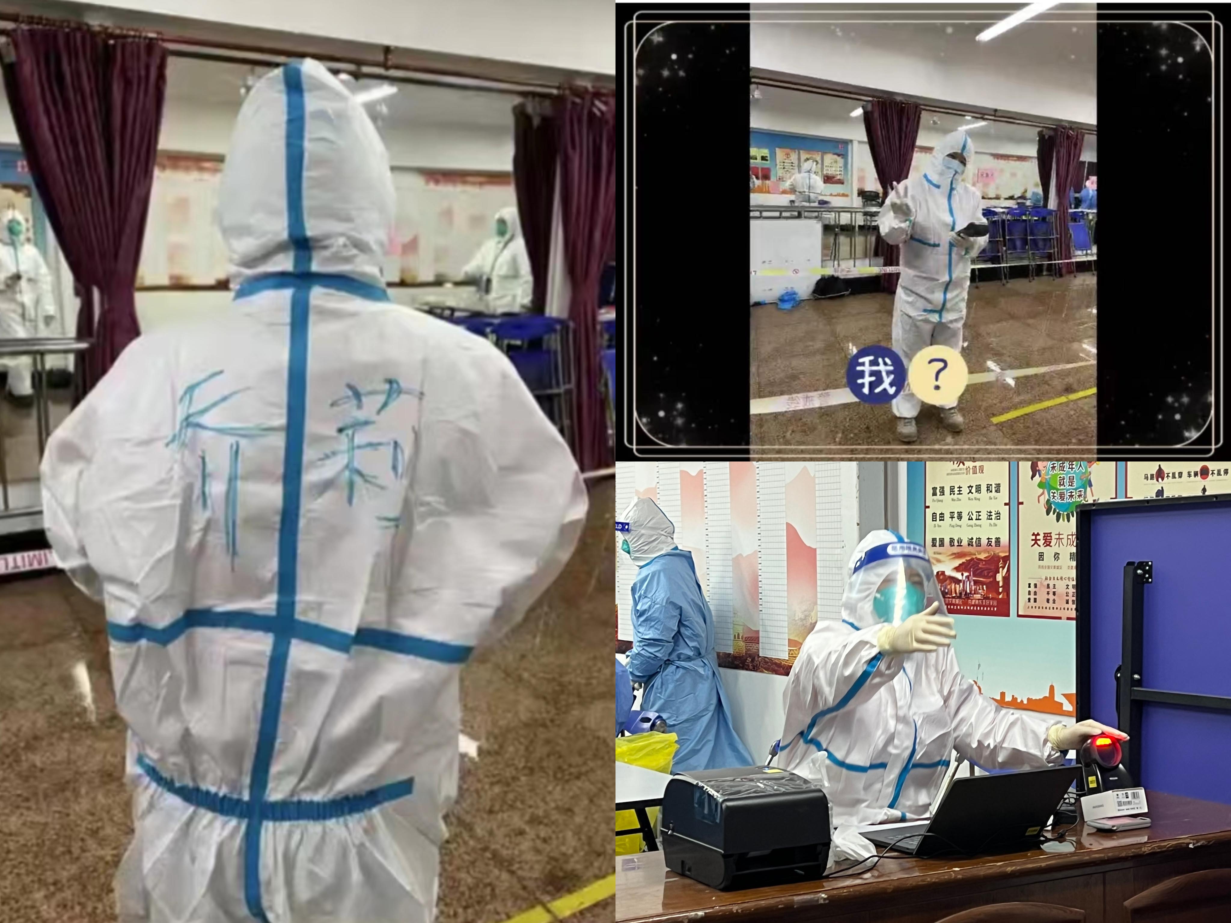 20日一早,根據前期工作會議指示,志愿者們5:45分到崗,天陰沉沉地,雖然告知居民會按門牌號通知大家,可6點開始的檢測已有居民等在門口排隊了。此時,我們工作節奏的弦更加繃緊了。做好對自己的防護也是關鍵之一,第一次穿上大白的防護服;第一次帶上防護面罩……第一次那么那么認真仔細的檢查自己的口罩、帽子、手套是否穿戴正確。(前一天特意反復觀看了正確穿脫防護服的視頻)。可是好不容易穿好防護服、帶上防護面罩,問題來了,雖然里面已經穿了很薄的一件T恤,身上已經出汗了,馬上面罩上就起了一層霧,看東西非常模糊,呼吸也有點困難,讓我第一次真真切切感受到抗疫前線醫護人員的不易。
