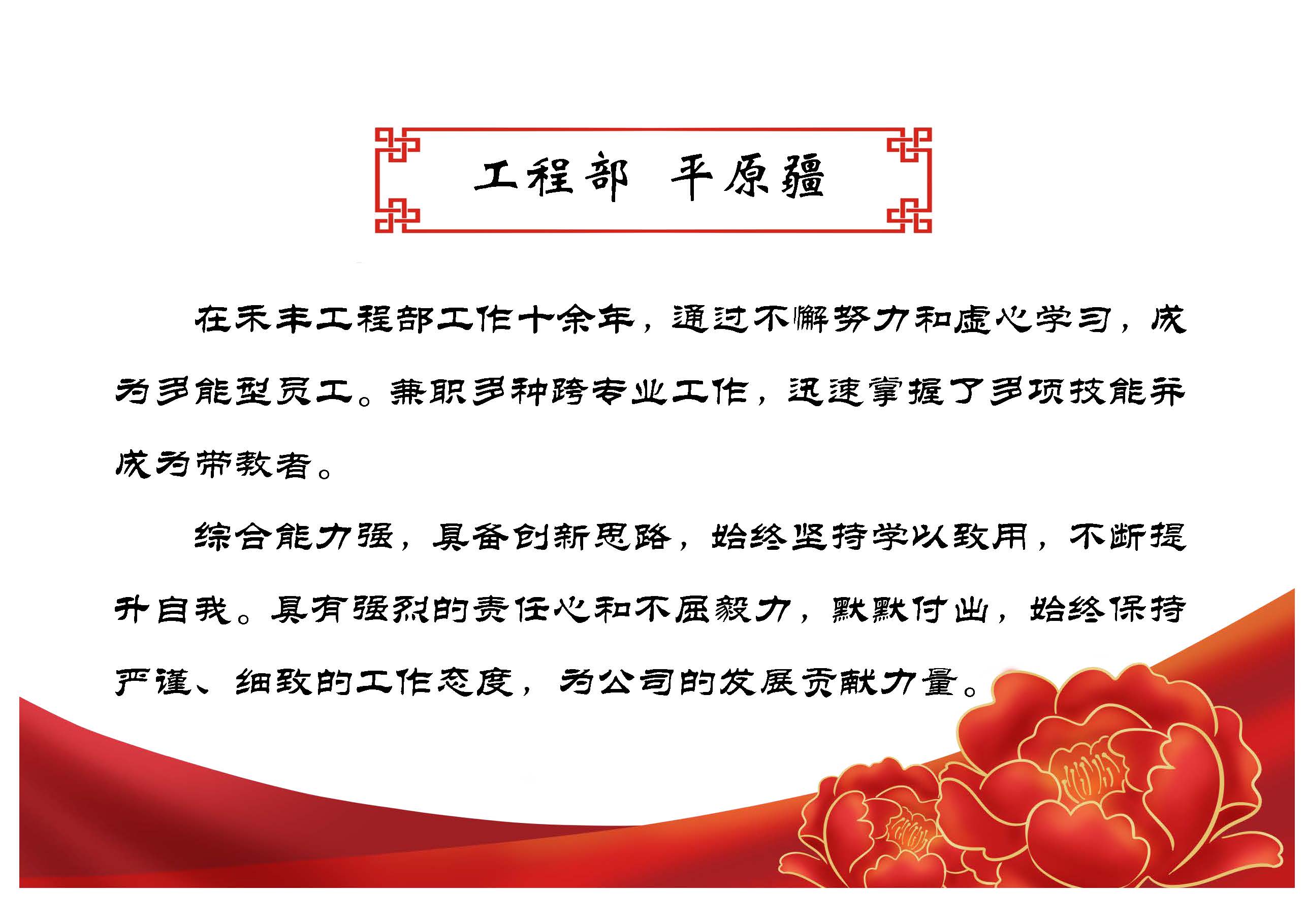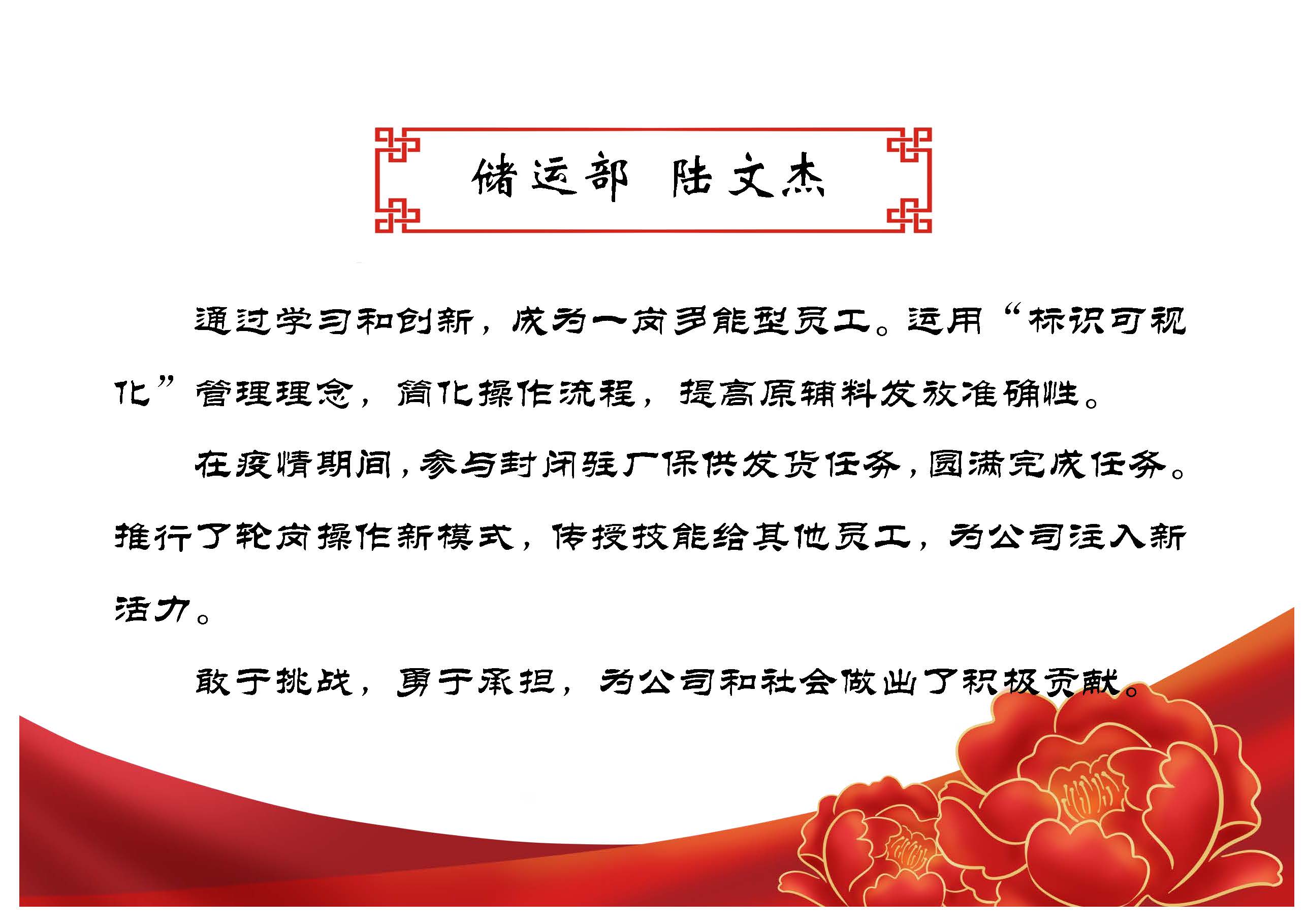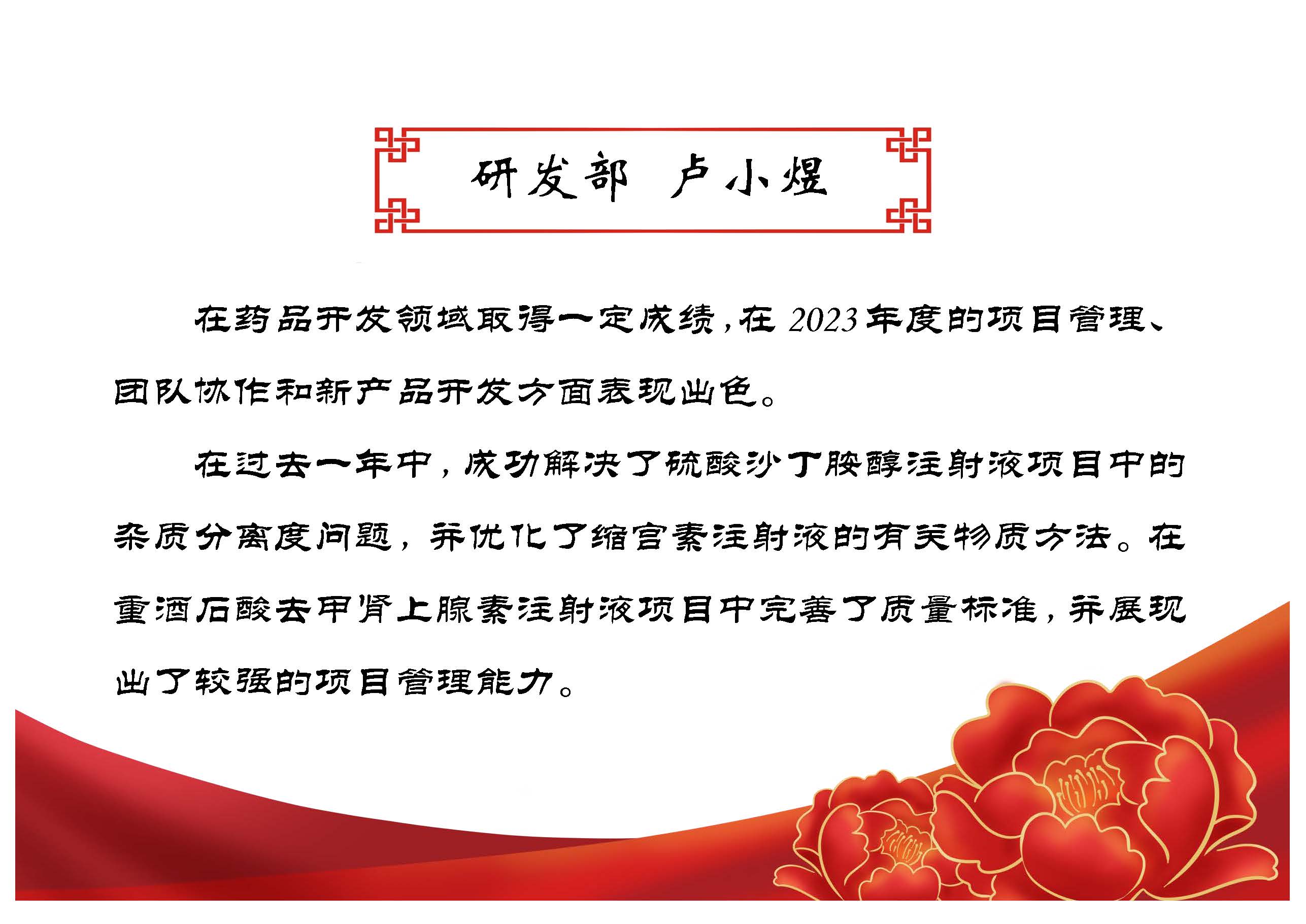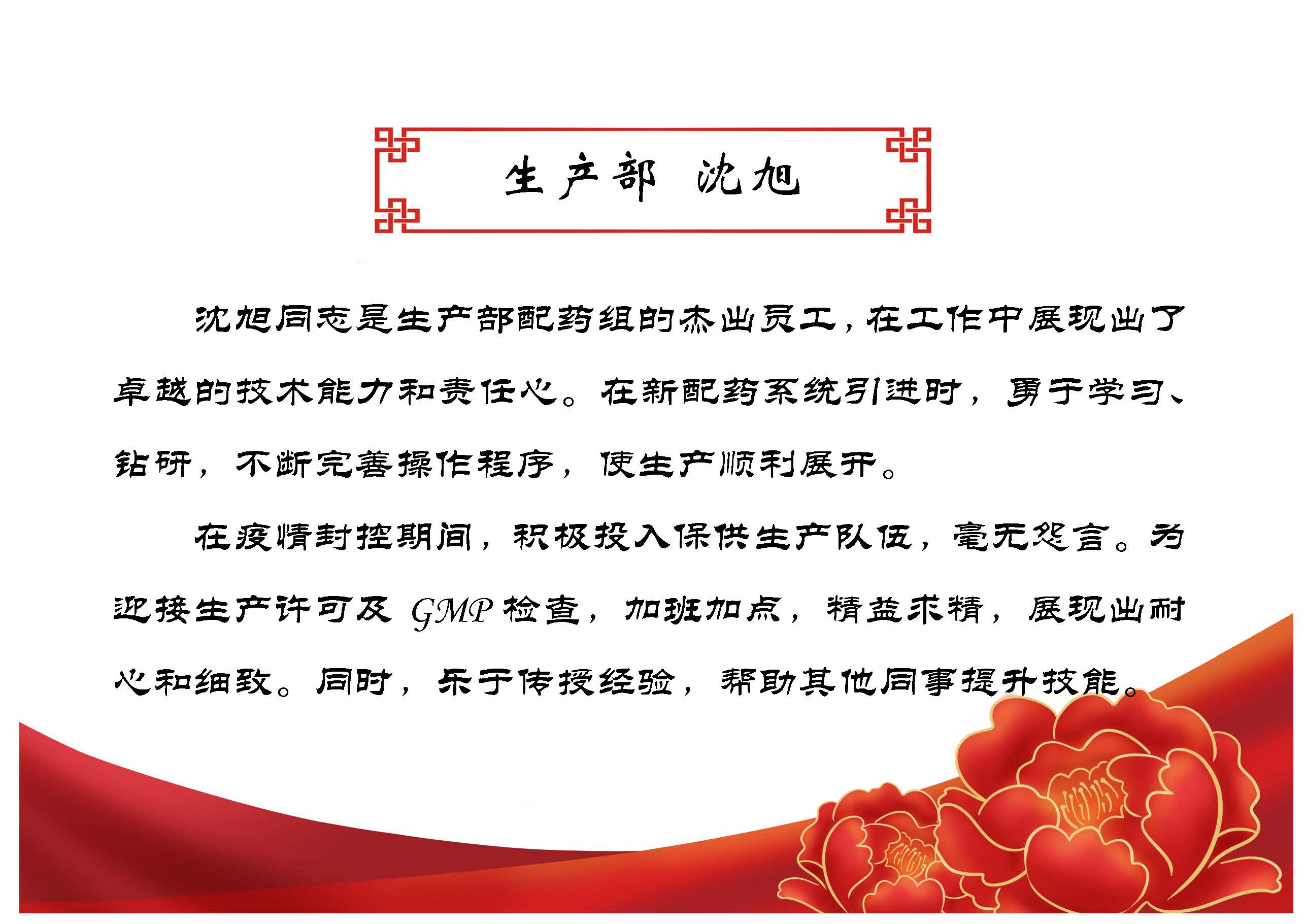 上海禾豐制藥有限公司廣大員工在禾豐黨政領導下,以“創新、誠信、合作、包容、責任”的核心價值觀為引領,緊緊圍繞公司發展的戰略目標,嚴謹扎實,勇于接受挑戰與變革;奮發有為,融入與促進精益管理建設;合作創新,積極推進質量一致性評價的順利開展,為禾豐的發展做出了顯著貢獻。特授予以下人員為2023年度“禾豐之星”暨先進個人稱號。望廣大員工弘揚先進,以他們為榜樣努力實現禾豐經濟發展目標。