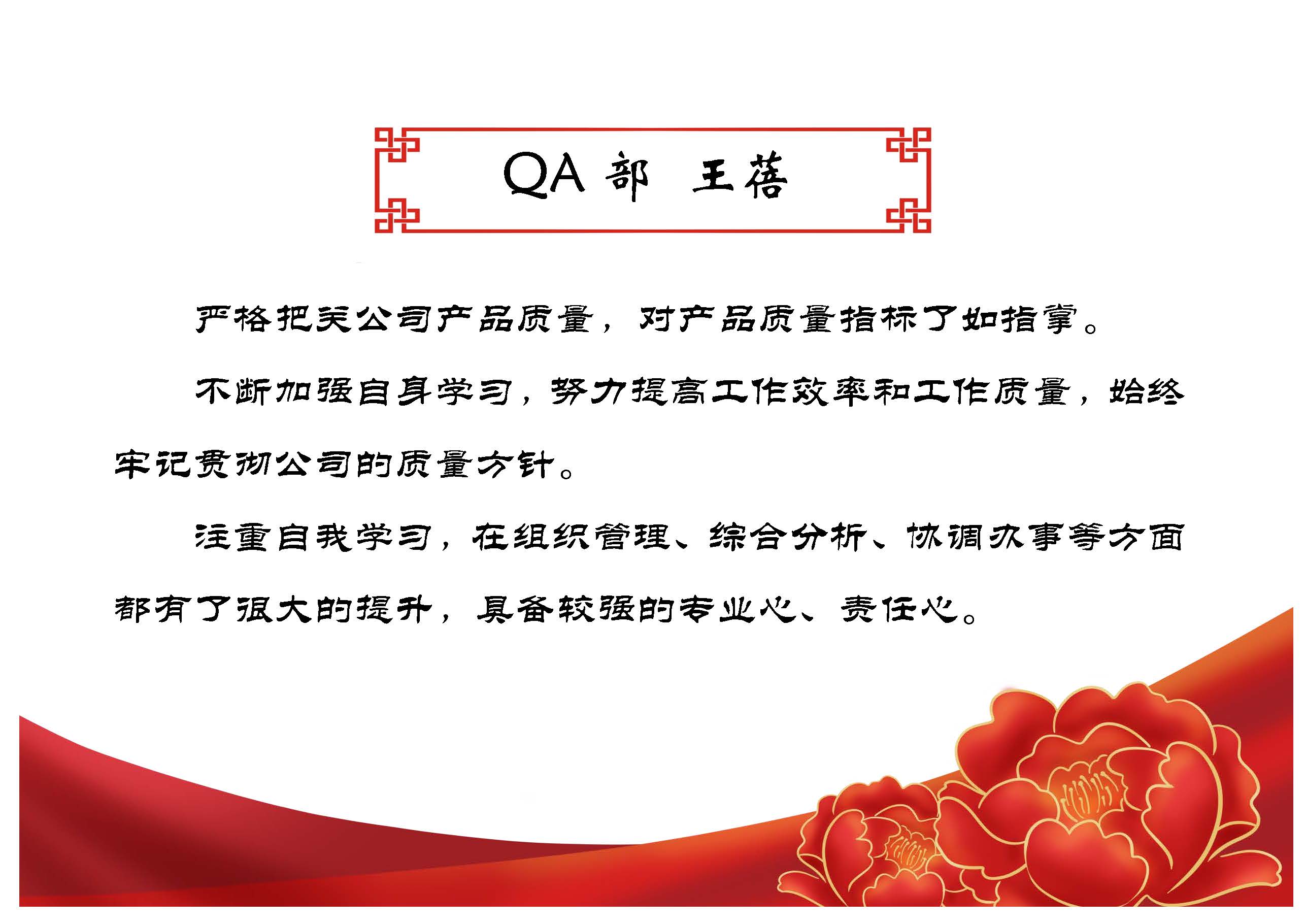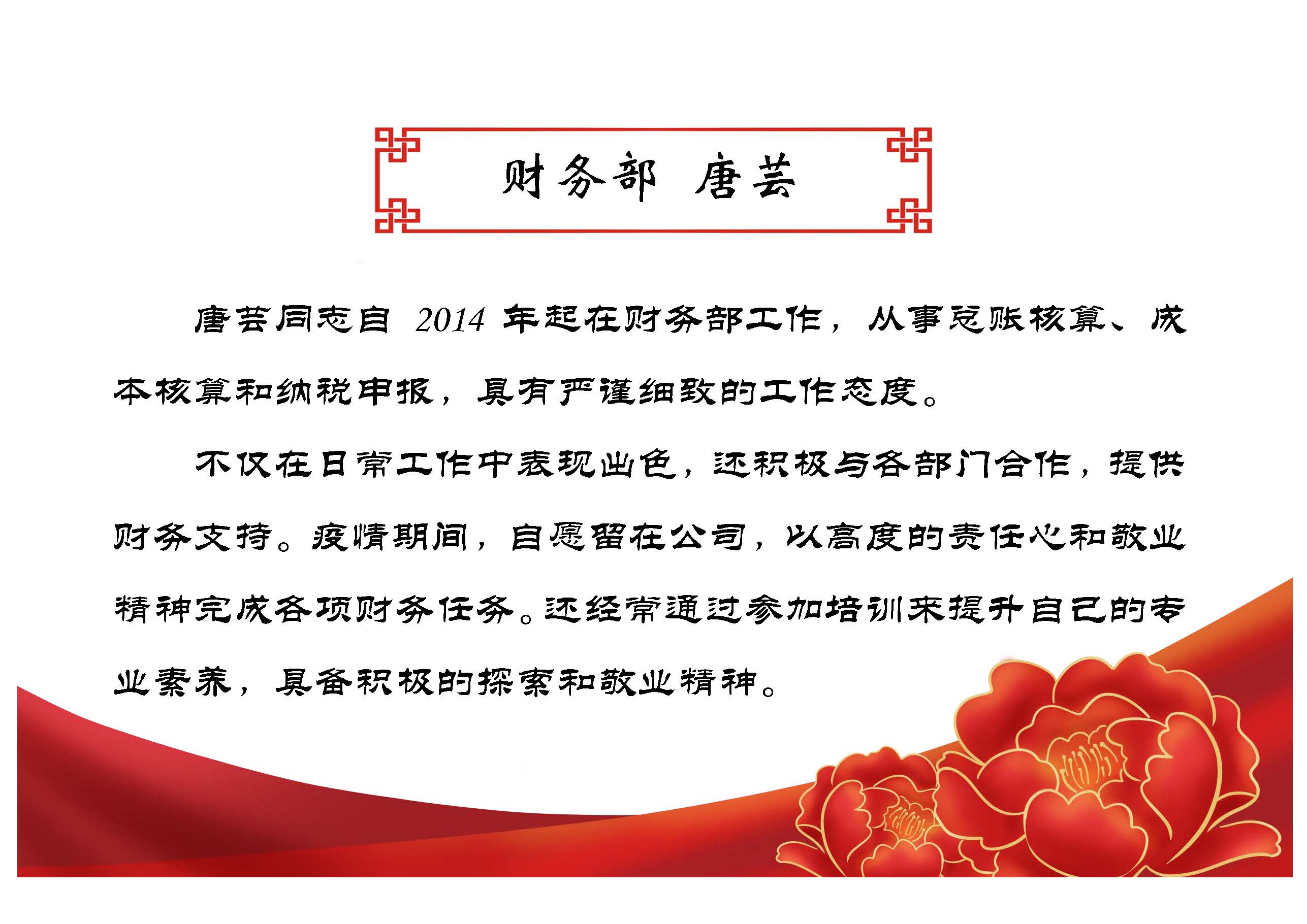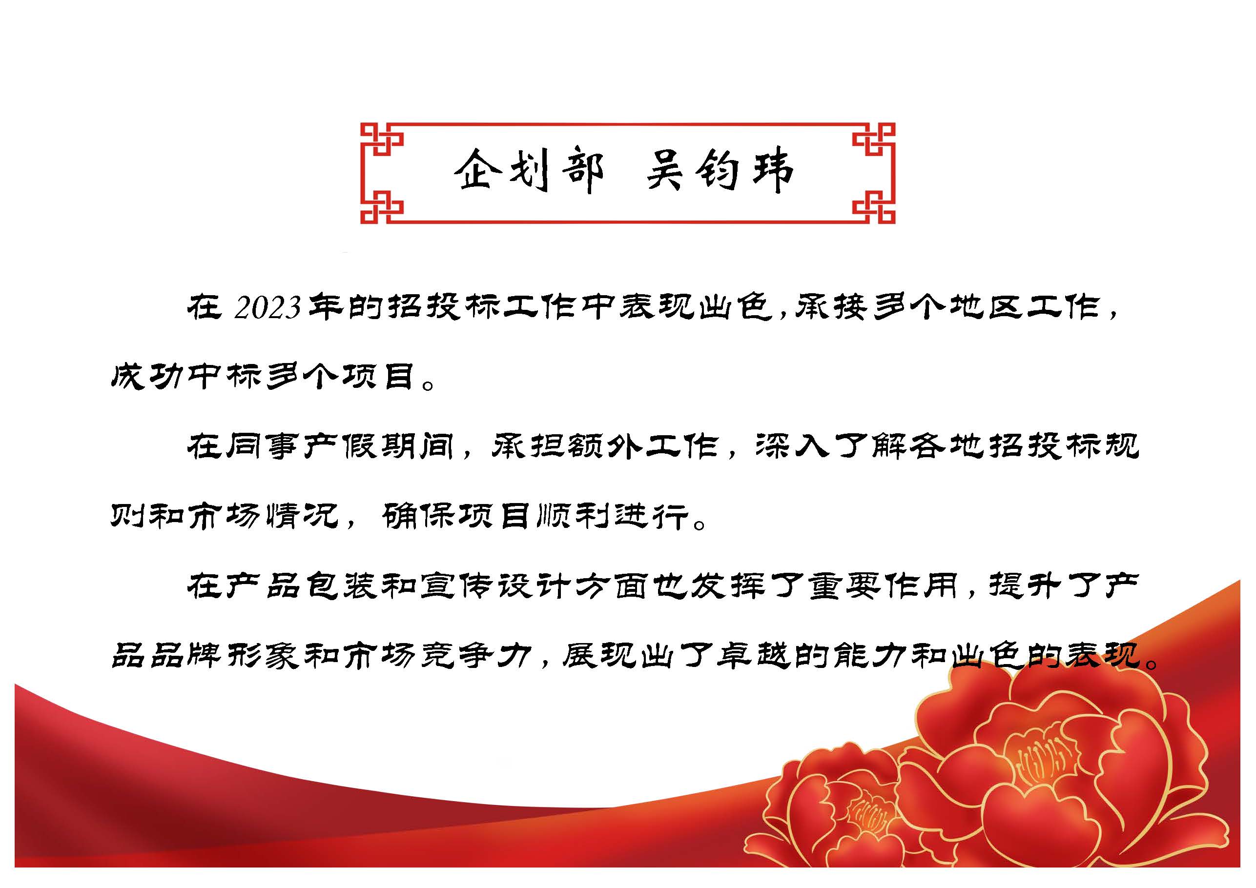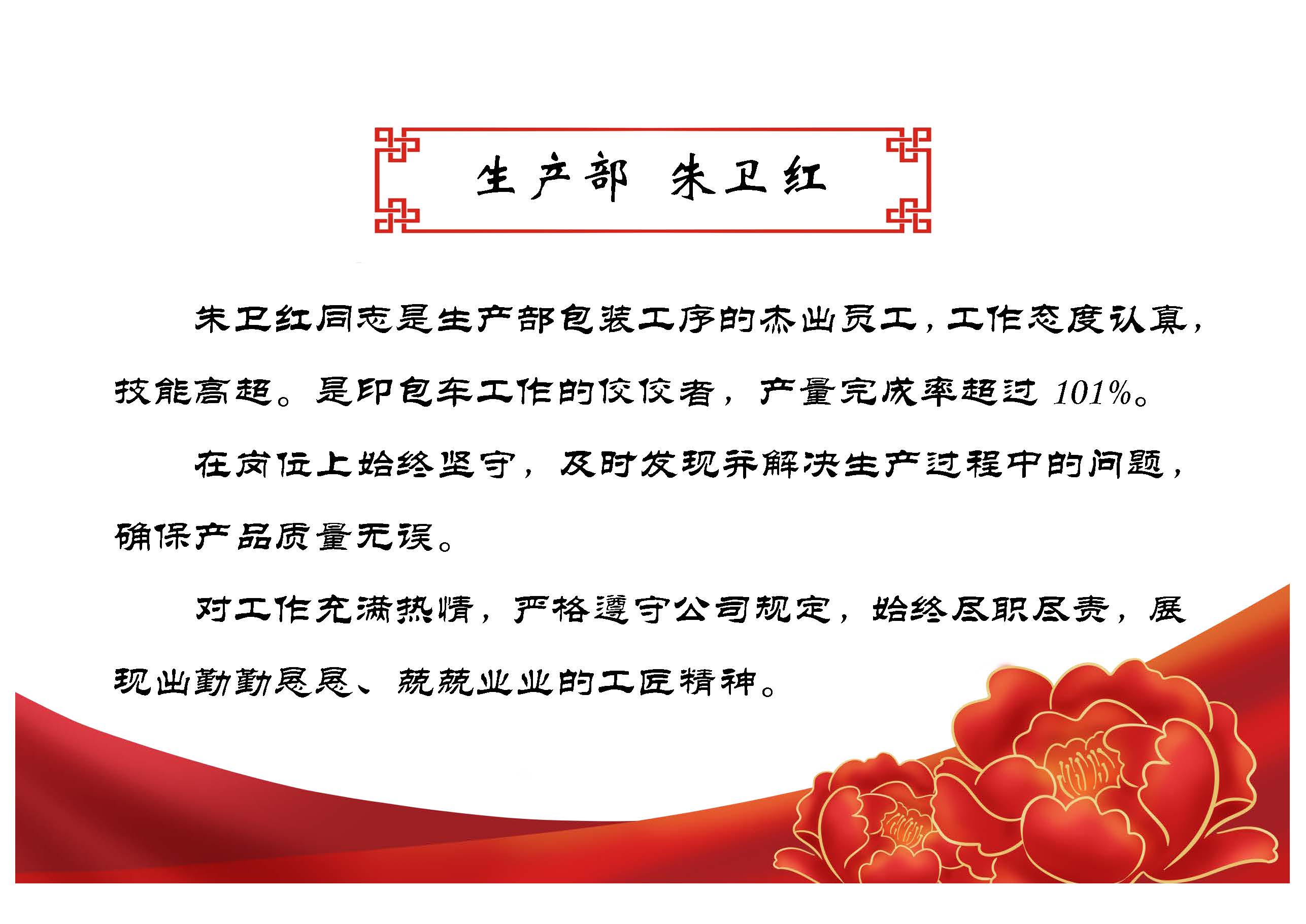 上海禾豐制藥有限公司廣大員工在禾豐黨政領導下,以“創新、誠信、合作、包容、責任”的核心價值觀為引領,緊緊圍繞公司發展的戰略目標,嚴謹扎實,勇于接受挑戰與變革;奮發有為,融入與促進精益管理建設;合作創新,積極推進質量一致性評價的順利開展,為禾豐的發展做出了顯著貢獻。特授予以下人員為2023年度“禾豐之星”暨先進個人稱號。望廣大員工弘揚先進,以他們為榜樣努力實現禾豐經濟發展目標。